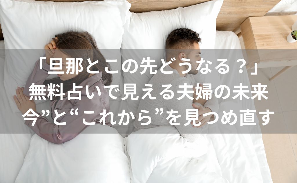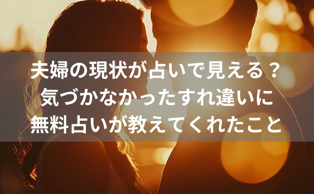※この記事はプロモーションを含みます。 無料占いは“夫婦の未来を断定するもの”ではなく、今の関係を見直し、すれ違いの原因や相手の気持ち、これから取るべき行動を知るための“気づきのツール”です。無料占いで分かることは、 今の夫婦関係の問題点 パー... -